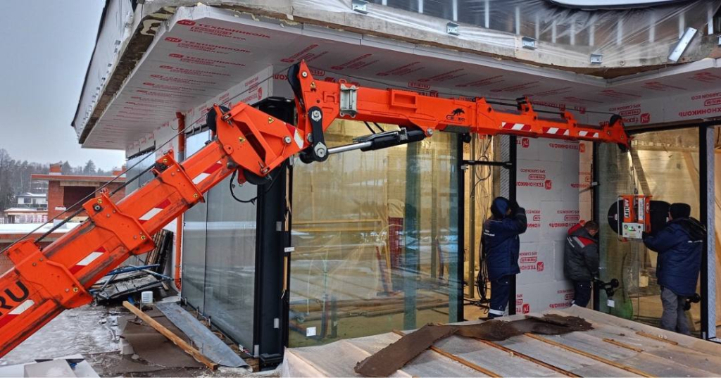 Стекло по верхней кромке уходило на 20–30 см внутрь — на тросе в такой геометрии просто не удержать груз в нужном положении. Выбрали монтаж через гусек на жесткой сцепке с помощью мини-крана паука SPX527CDH. Захват зафиксировал стекло точно под нужным углом, кран поднял и перенес конструкцию на место, а бригада завела ее в проем.