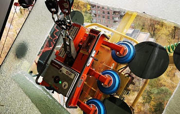 Вакуумный захват Arlifter GS-500 с радиальным комплектом произвел установку стеклопакетов весом более 300 кг на высоте многоэтажного дома.