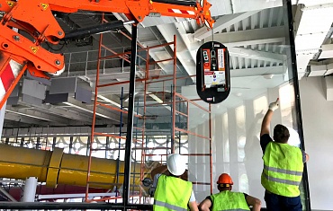Ударными темпами, с помощью мини-крана Jekko SPD 360 и вакуумного захвата GS 500, произвели монтаж стеклянных ограждений на стадионе «Динамо»