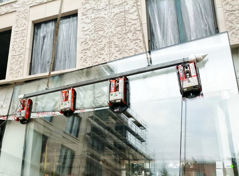 При остеклении отеля в одном из районов Москвы для монтажа стекол весом от 1500 до 1800 кг использовали сразу несколько вакуумных захватов Арлифт линейки GS с грузоподъемностью 500 и 850 кг. Проверенное современное оборудование собственной разработки компании, отвечает всем российским стандартам и международным требованиям. Благодаря системе влагоотделения, монтаж можно проводить в любых погодных условиях: и в дождь, и в снег. Допускается работа при температурах до -25 С°.