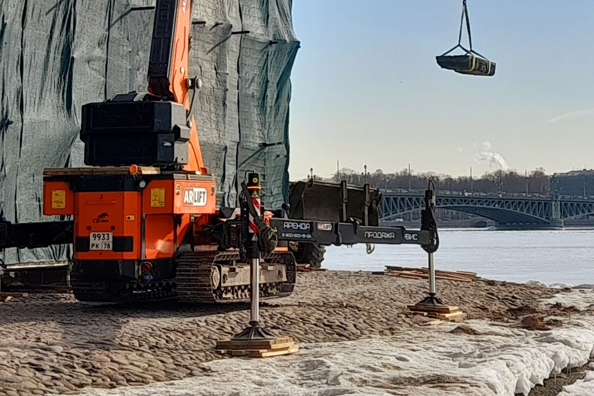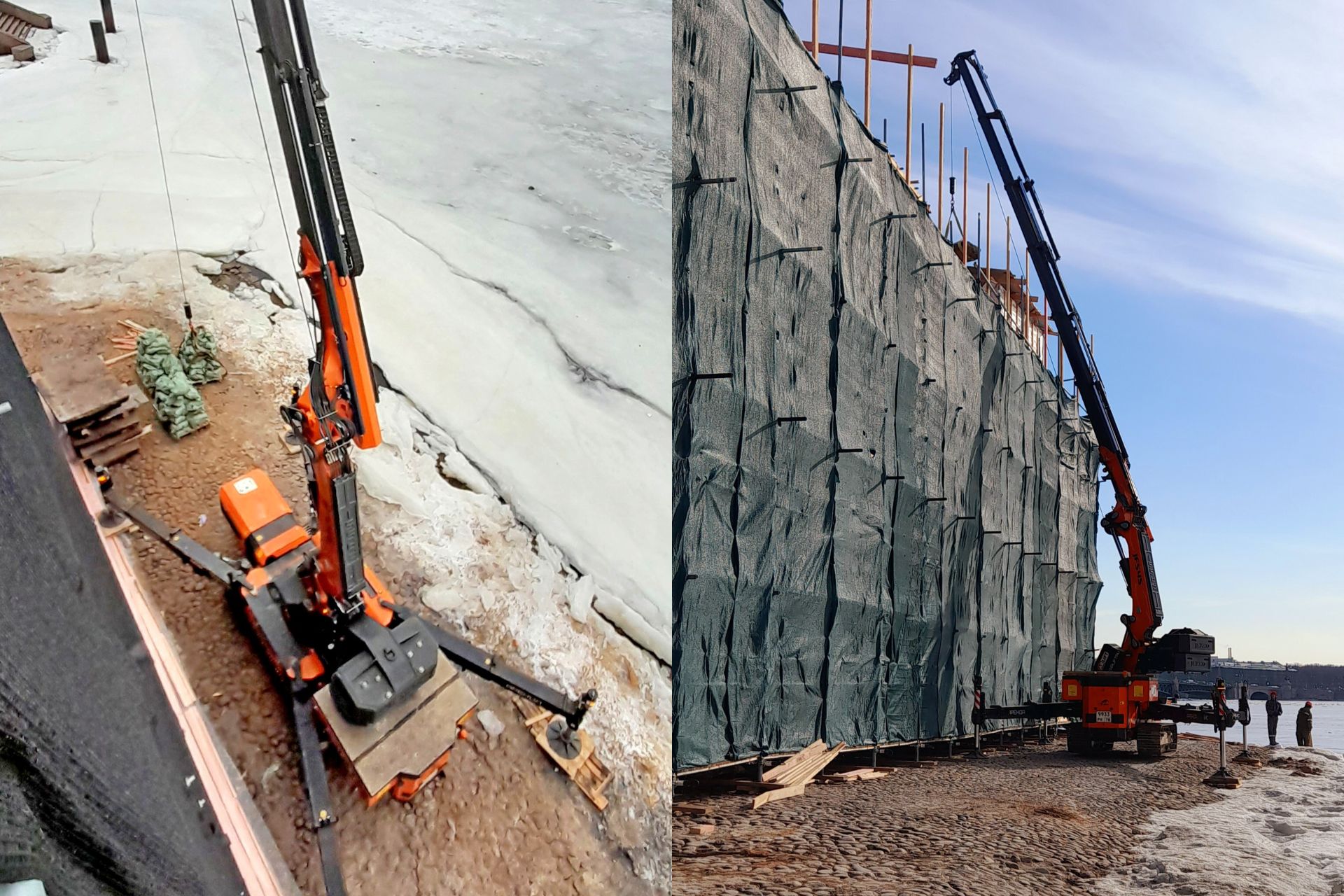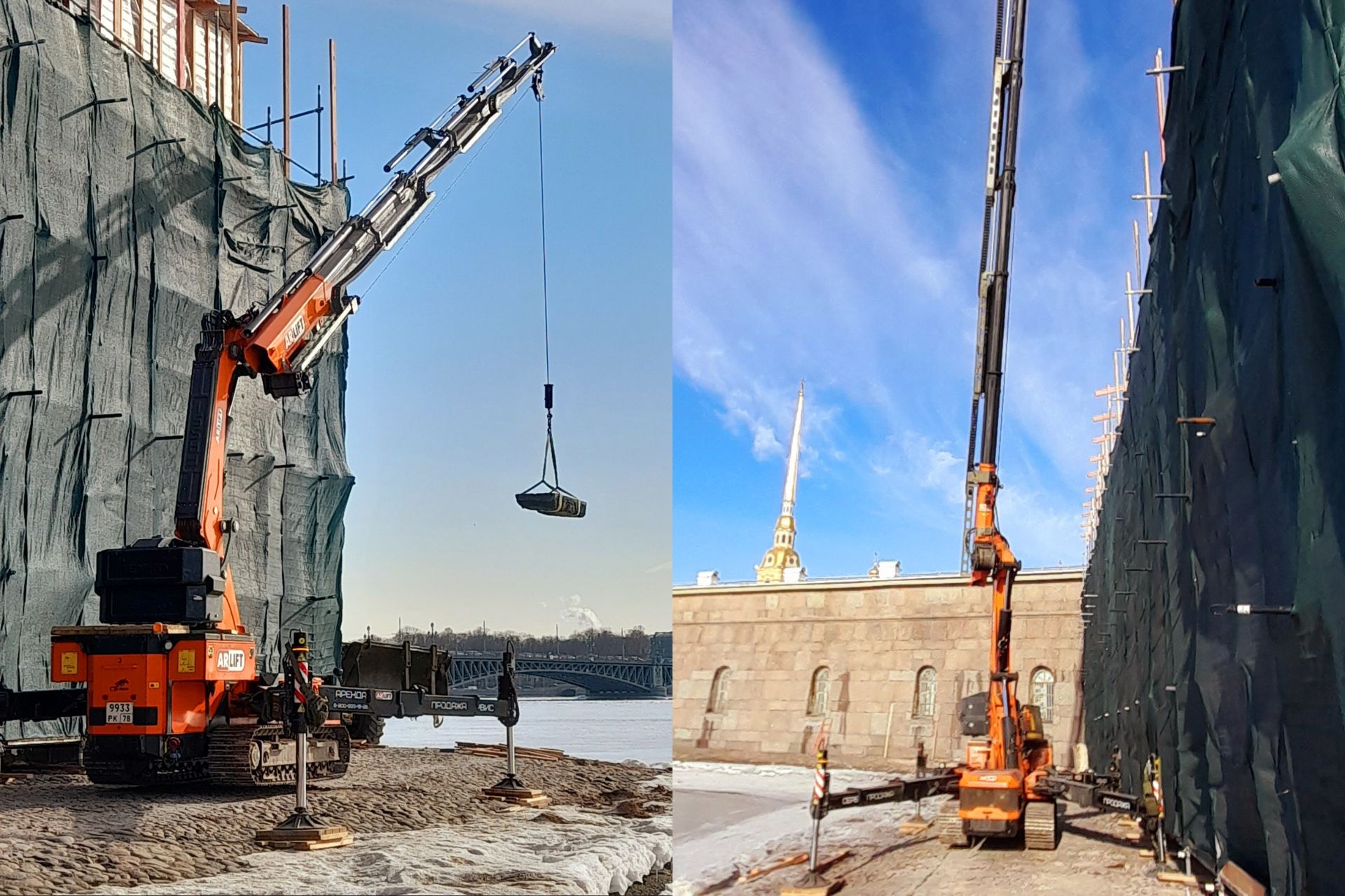 Решение нашли в манёвренности и компактных габаритах мини-крана JF545CDH-2: грузоподъёмность 15,5 тонн при ширине меньше 2 метров, а рабочая высота — 31 метр. Когда Нева нас подтапливала, мы прижимали кран вплотную к фасаду крепости. И работы продолжались на той минимальной площади берега, которая ещё оставалась над водой.