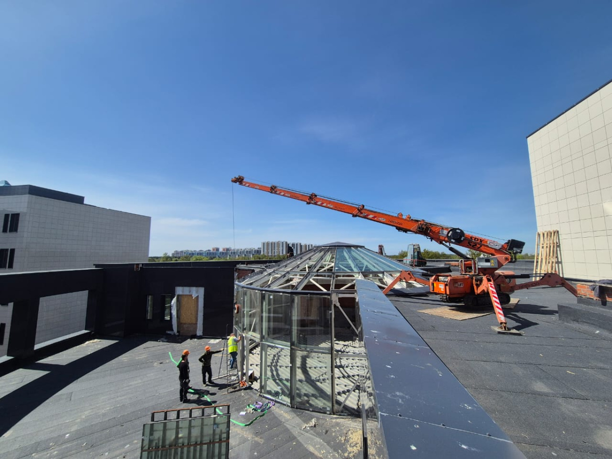 Монтаж радиального стекла с помощью стеклоробота Арлифт