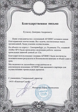 Благодарность ООО «Квантор-Строй»